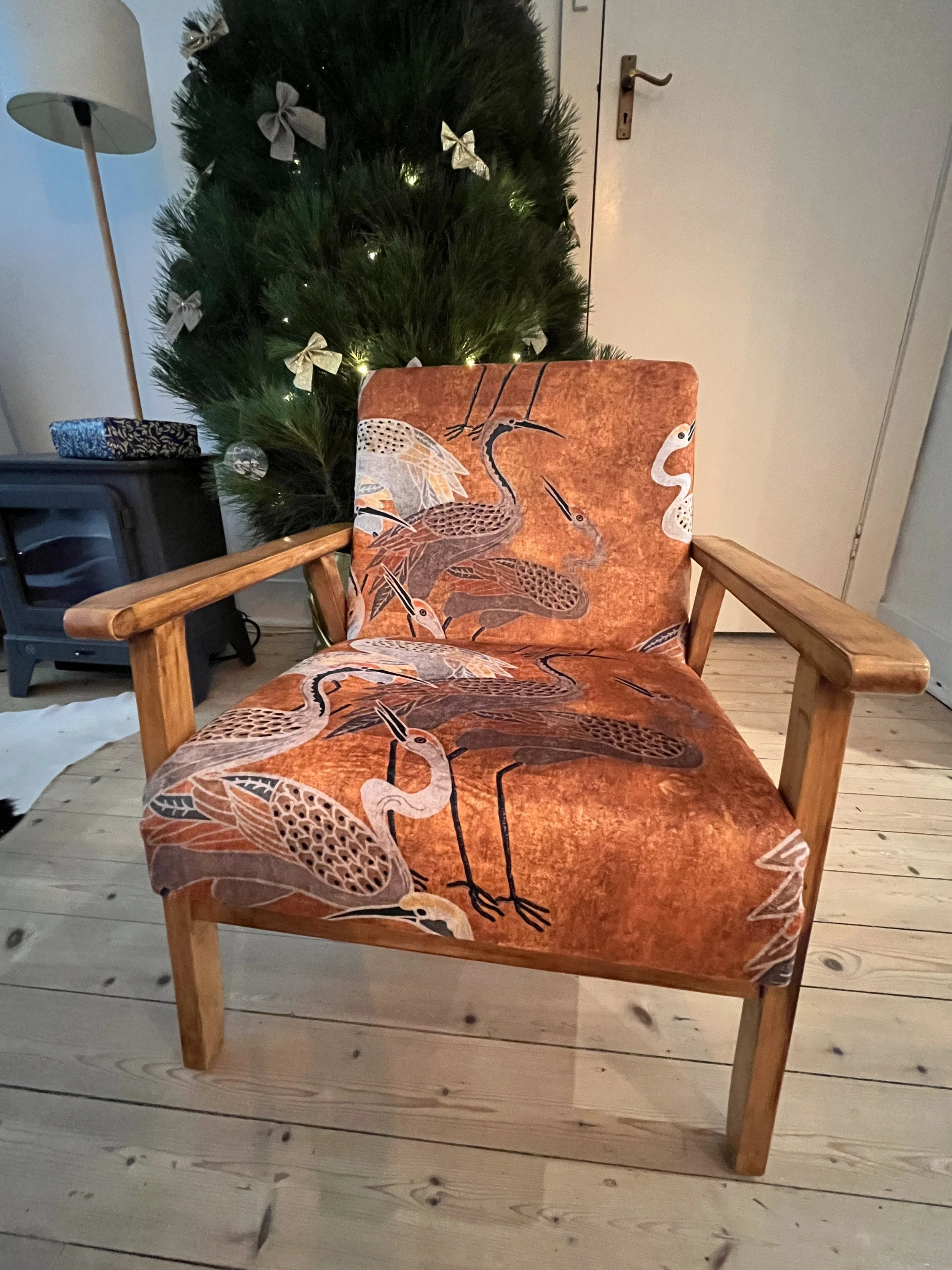 A charming armchair featuring an elegant crane bird motif.