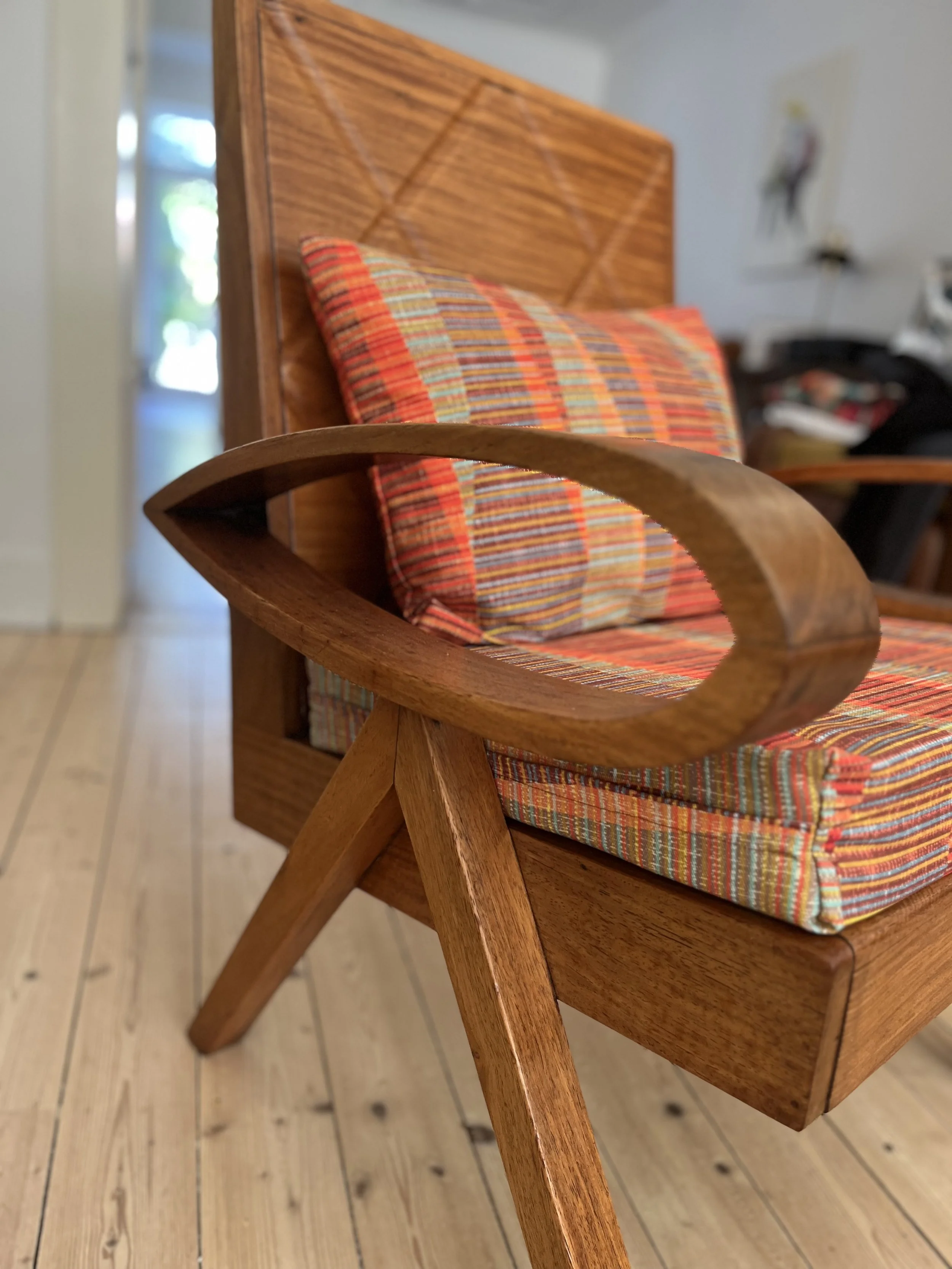 The rich wood tones combined with the vibrant, retro fabric make this piece a cozy and stylish addition to any space!