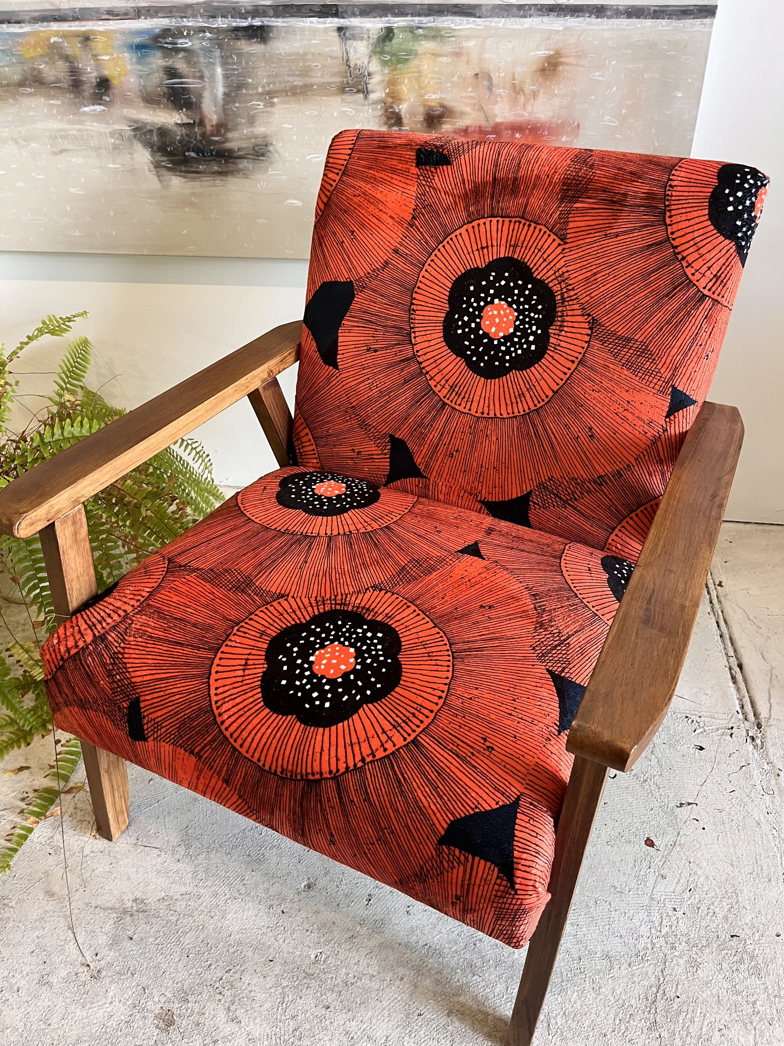 This gorgeous mid-century armchair has been lovingly restored and reupholstered with bold, vibrant fabric. Comfortable, stylish, and ready to brighten up any room!